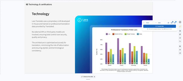 Die Lara-Browsererweiterung lässt sich in Google Slides integrieren, sodass Sie den gesamten Text auf einer Folie auf einmal übersetzen können – unter Beibehaltung von Formatierung und Layout.