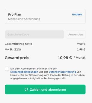 Um auf Lara Pro zu aktualisieren, klicken Sie direkt in der Seitenleiste auf die Schaltfläche „Upgrade auf das Pro-Paket“ und wählen Sie durch Klicken auf „Ändern“ zwischen monatlicher oder jährlicher Abrechnung. Die jährliche Abrechnung zeigt einen monatlichen Gegenwert an und wird einmal pro Jahr berechnet.