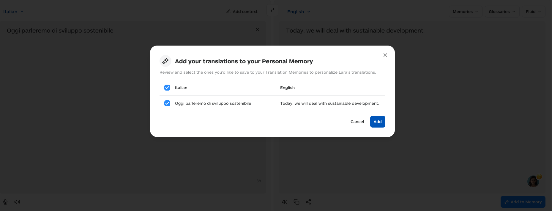 Mit Lara können Sie jetzt Ihr eigenes personalisiertes Übersetzungsspeicher erstellen, indem Sie manuelle Änderungen und Korrekturen speichern. Dieses Update stellt sicher, dass Ihre Übersetzungseinstellungen gespeichert und konsequent auf zukünftige Übersetzungen angewendet werden. Egal, ob Sie ein einzelnes Segment verfeinern oder mehrere Zeichenfolgen in einer Sequenz anpassen, Lara hilft Ihnen, die Konsistenz und Genauigkeit der Übersetzung zu gewährleisten und sich gleichzeitig an Ihren Stil anzupassen.