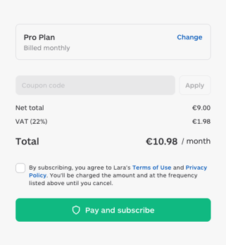 To upgrade to Lara Pro, click the "Upgrade to Lara Pro" button directly from the sidebar and choose monthly or annual billing by clicking on Change. Annual billing shows a monthly equivalent and is charged once per year.