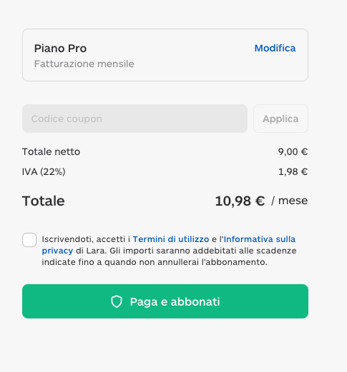 Per passare a Lara Pro, clicca sul pulsante "Passa al piano Pro" direttamente dalla barra laterale e scegli la fatturazione mensile o annuale cliccando su Modifica. La fatturazione annuale mostra un equivalente mensile e viene addebitata una volta all'anno.